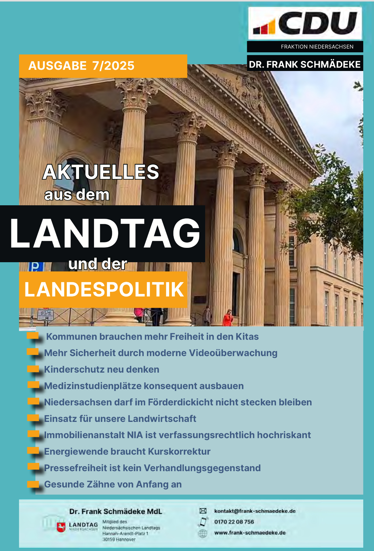 Mit seinem aktuellen Newsletter möchte unser Landtagsabgeordneter Dr. Frank Schmädeke Ihnen spannende Einblicke in die Arbeit des Niedersächsischen Landtages geben. Die Sommerpause ist vorbei – und es gibt viele wichtige Themen, die uns in Niedersachsen bewegen: